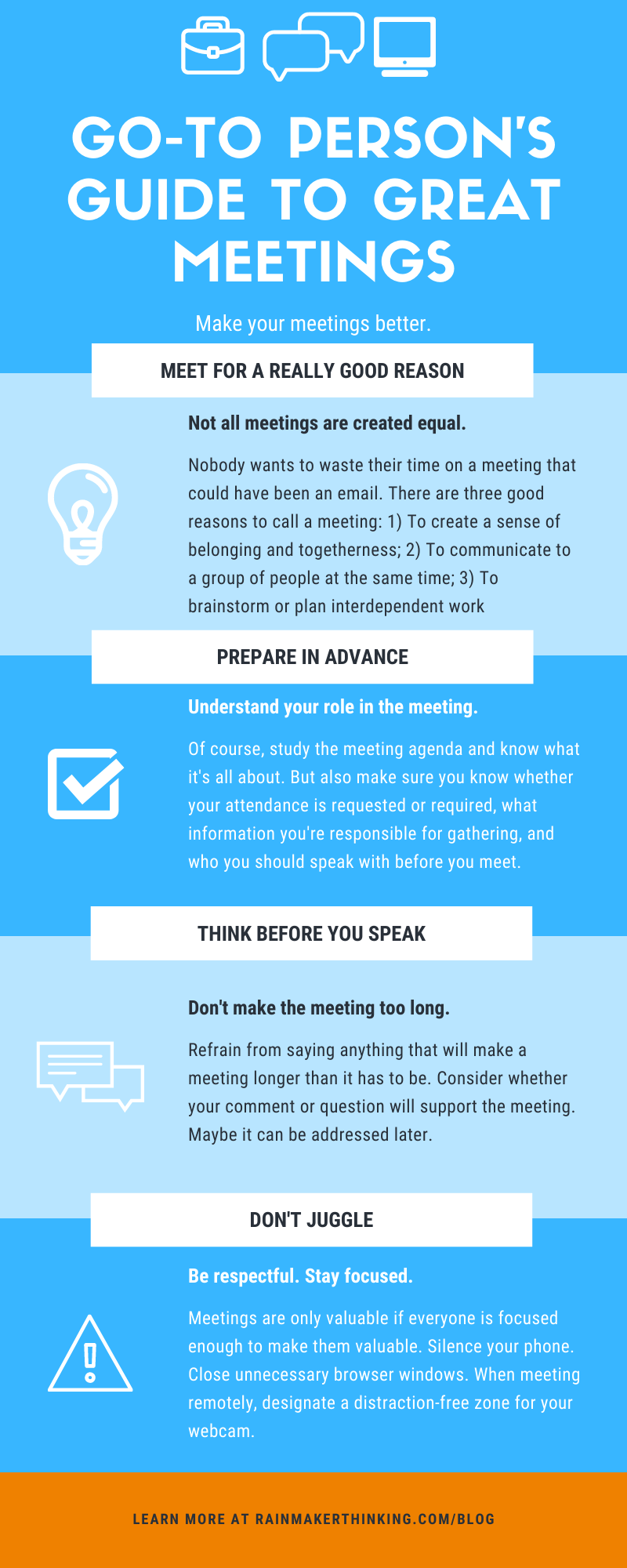 And try not to say a single word that will unnecessarily lengthen a meeting. Respect everyone’s time by only saying what really needs to be said.
